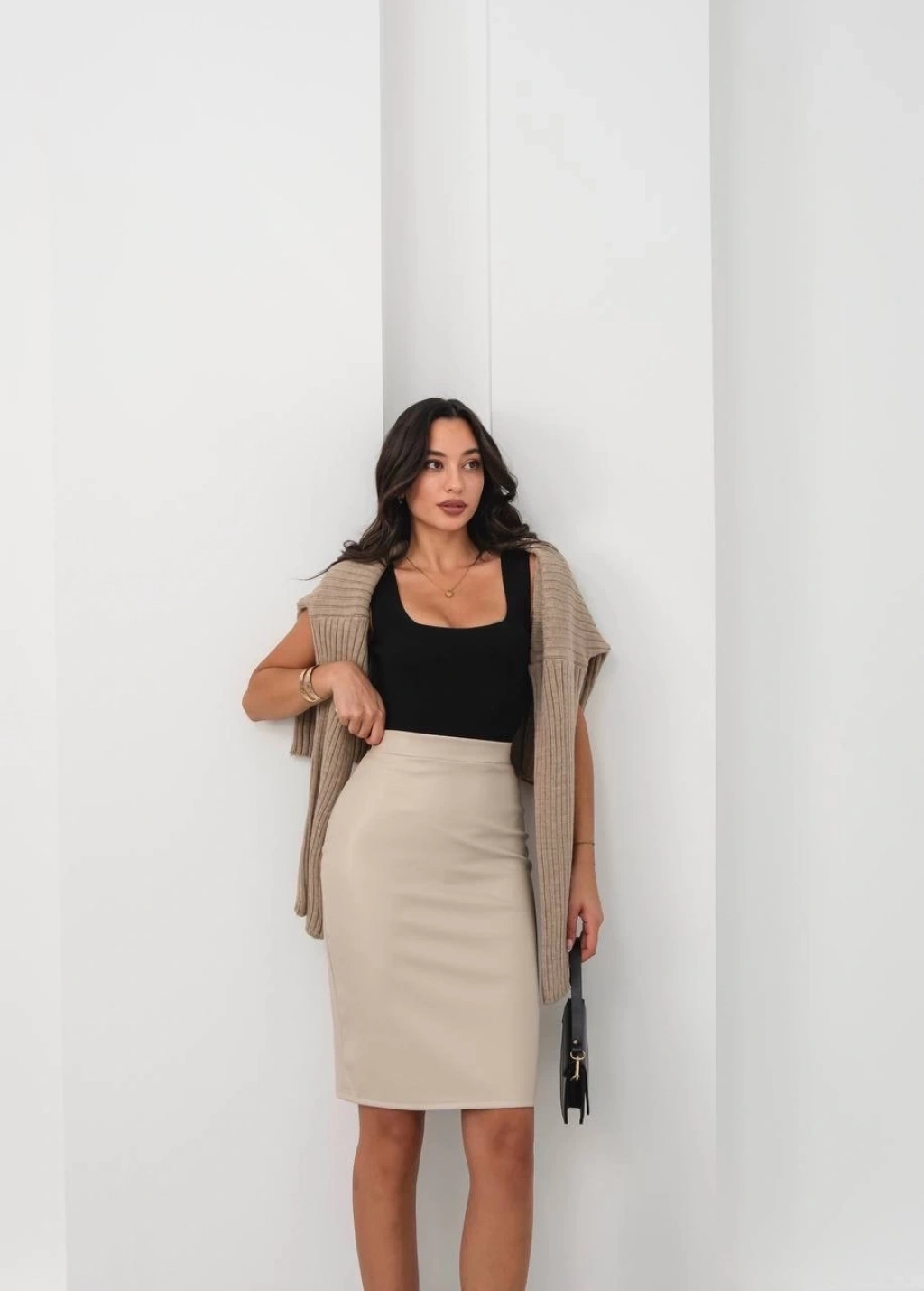 Arkadan yırtmaçlı kalem etek bej, şıklığı ve zarafeti bir arada sunar. Hem günlük kullanıma uygun hem de özel davetlerde tercih edilebilecek bir parçadır.