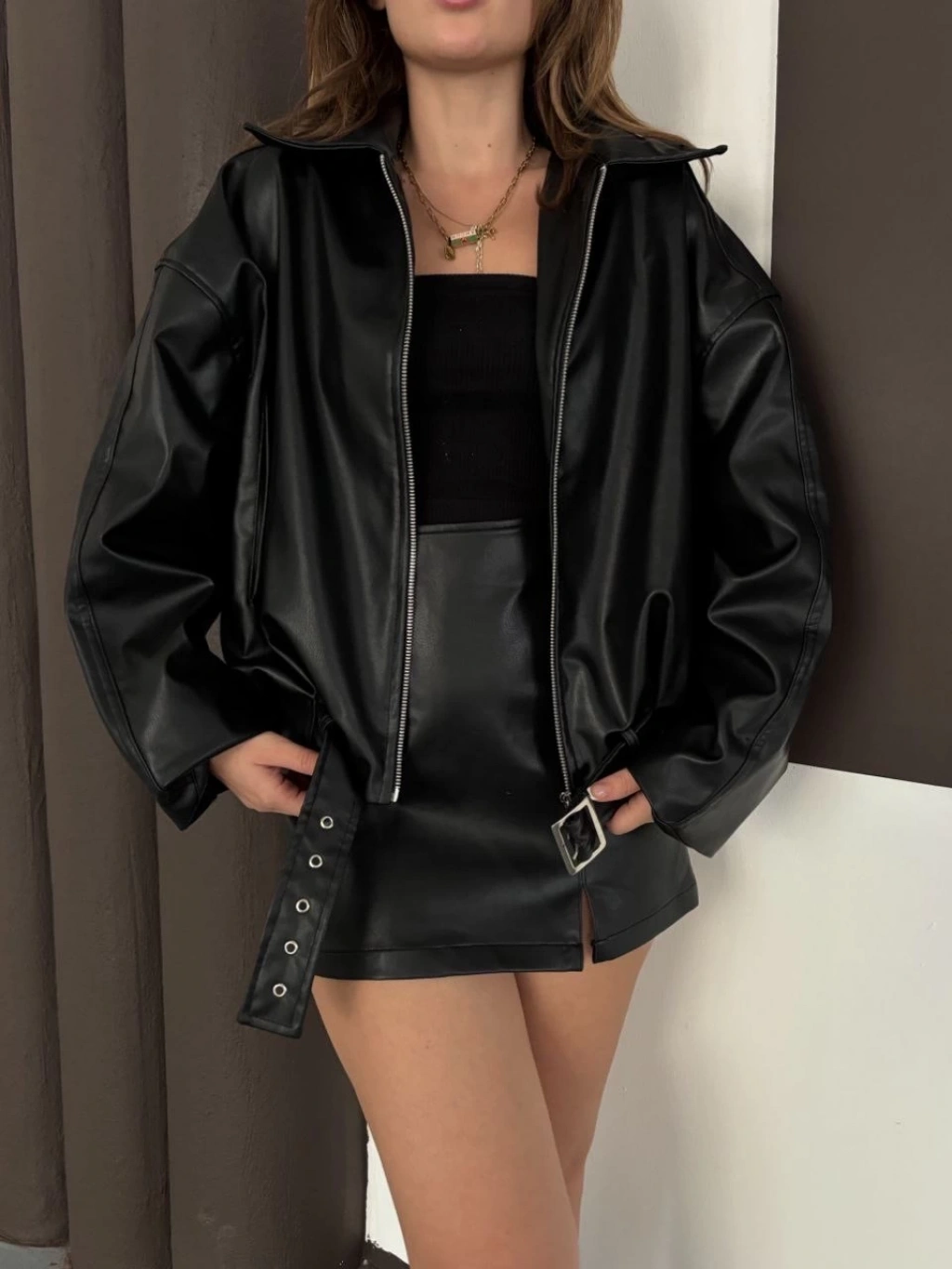 Astarlı kemerli pb deri ceket siyah onst