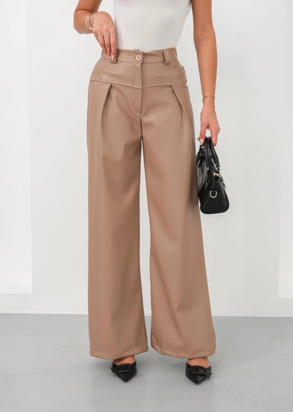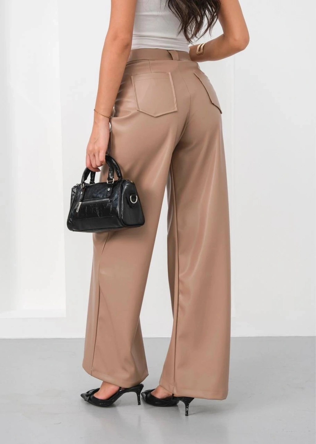 Deri geniş paça beli lastikli pantolon bej h263644, hem şık hem de rahat bir seçenektir. İşte bu pantolonun öne çıkan özellikleri: