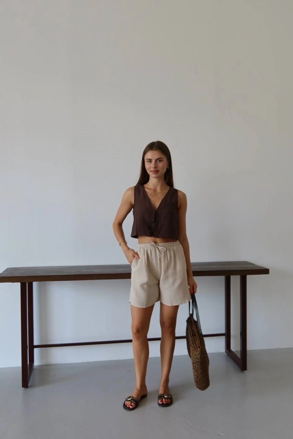 Bu bağcıklı bej şort, hem şık hem de rahat bir seçenektir. Müslin kumaştan üretilmiş olan bu şort, yaz aylarında vazgeçilmeziniz olmaya aday. İster günlük kombinlerinizde ister plajda şık bir alternatif arıyorsanız, bu şort tam size göre!